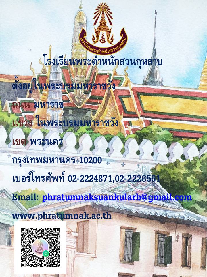 โรงเรียนพระตำหนักสวนกุหลาบ ในพระบรมมหาราชวัง พระนคร กรุงเทพมหานคร 10200 โทร 02-2226561 โทรสาร 02-2226557 Email :