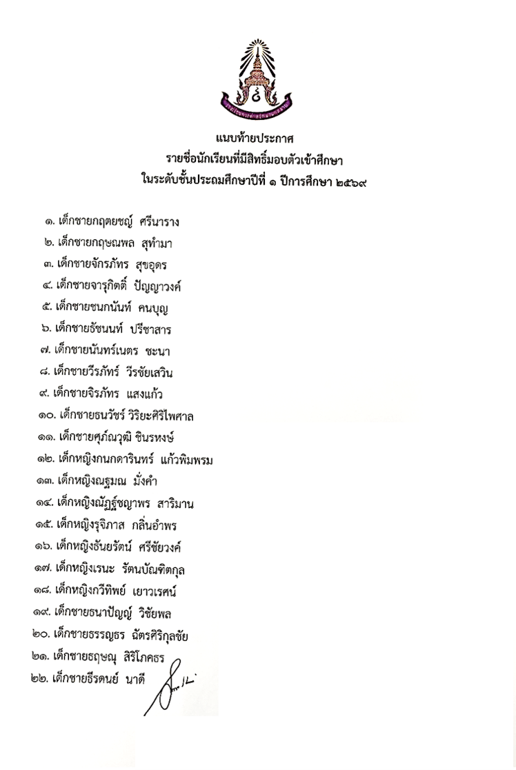 ประกาศรายชื่อนักเรียนที่มีสิทธิ์มอบตัวเข้าศึกษา ในระดับชั้นประมศึกษาปีที่1 ปีการศึกษา ๒๕๖๙